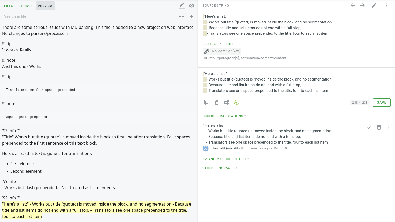 I was informed that we’ve released a few improvements for MD file processing, and this issue (related to admonitions) should be fixed by now. Please note that file reimport might be needed.