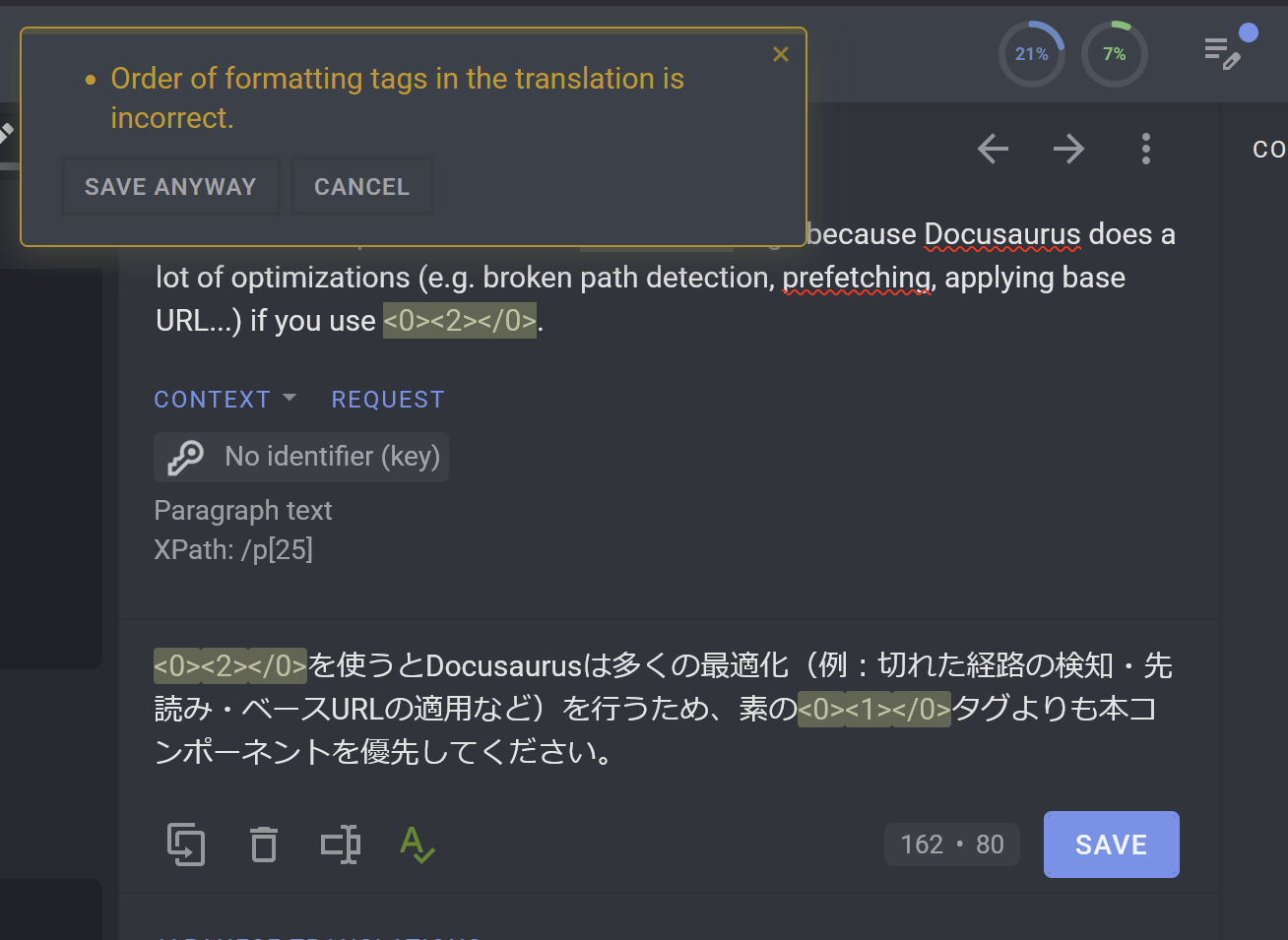 Right now, our QA check is purely technical - it only compares the order of tags and doesn’t take language grammar into account (for example, SOV word order in Japanese). That’s why you may see a warning even if the tags are actually correct. In such cases, it’s safe to click “Save Anyway.”