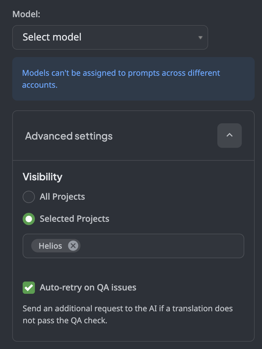After you have connected the selected provider (either via your API Key or via Crowdin (if supported)), you can create a pre-translation prompt and manage it throughout your projects.