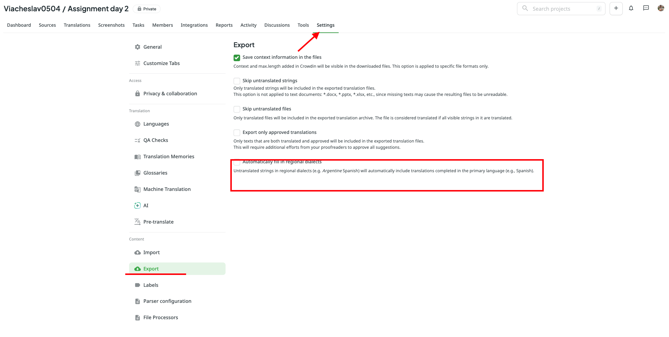 An alternative approach here would be to enable the “Automatically fill in regional dialects” option in your project’s export settings. In this scenario, when you have English and English, United States (for example) set as target languages, you will not see the translations present within the UI for the English, United States, but after export, they will be the same as for English:
