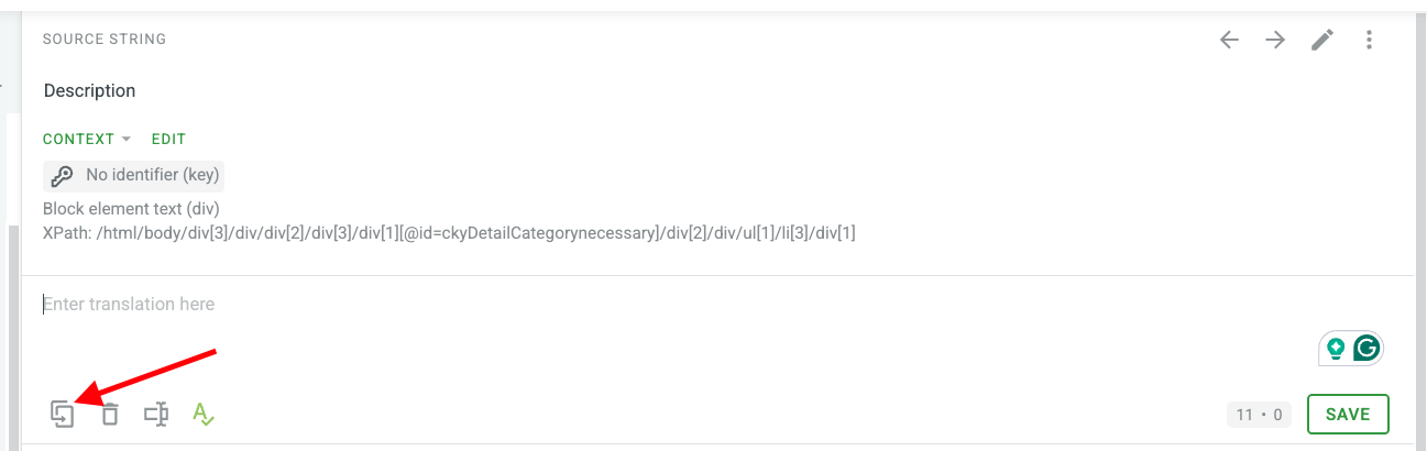 Crowdin’s UI option allows you to use either “CTRL-SHIFT-C” combination or the “Copy Source” button within the Editor: