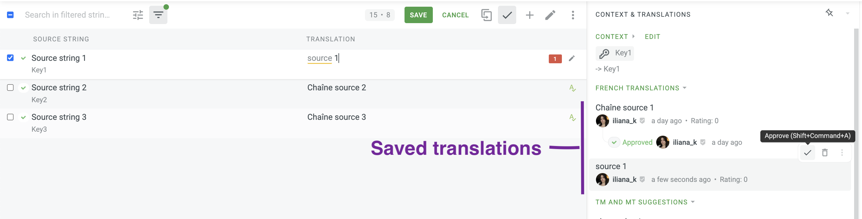 If a translation you are trying to submit is exactly the same as one that is already saved, the system prevents you from saving the duplicate.