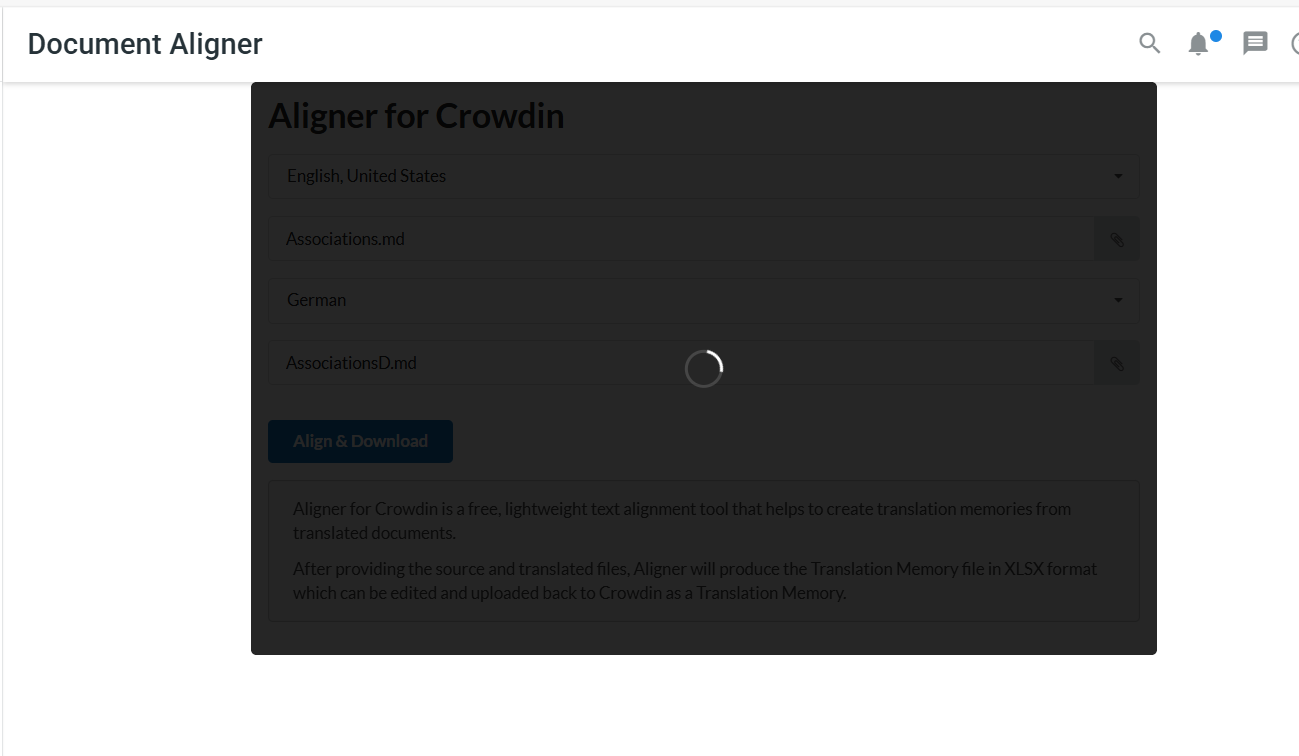 To assist you better, could you please provide a screenshot of the error you’re encountering (not from our UI, but from the Browser developer console), as well as the types of files you are trying to align? This information will be crucial for our technical team to diagnose the problem. You can send this info to us directly (support@crowdin.com)